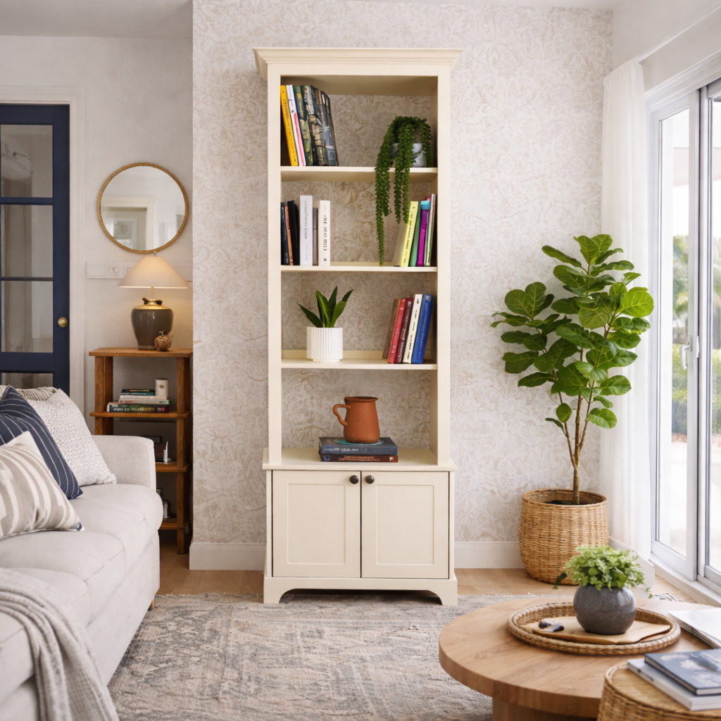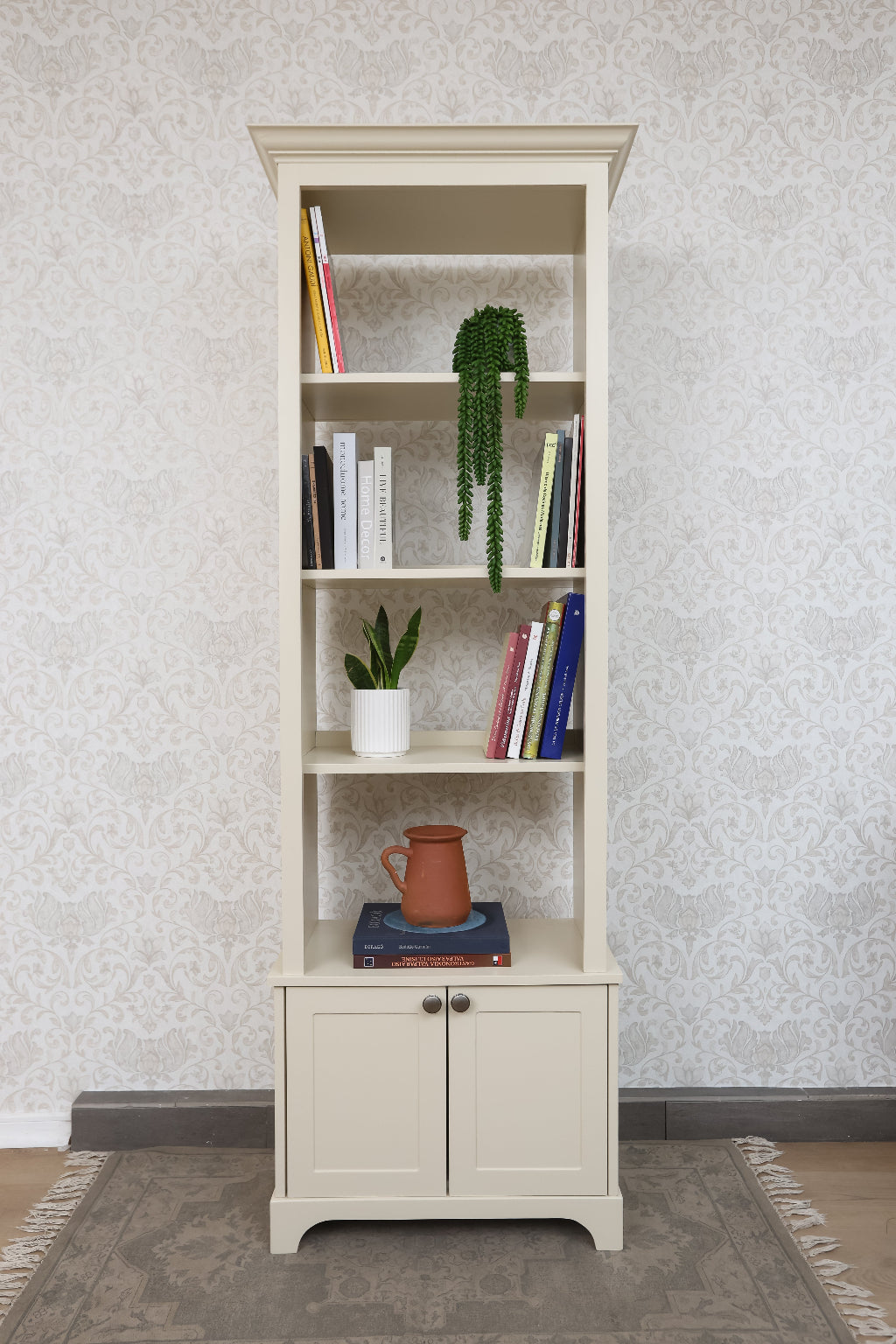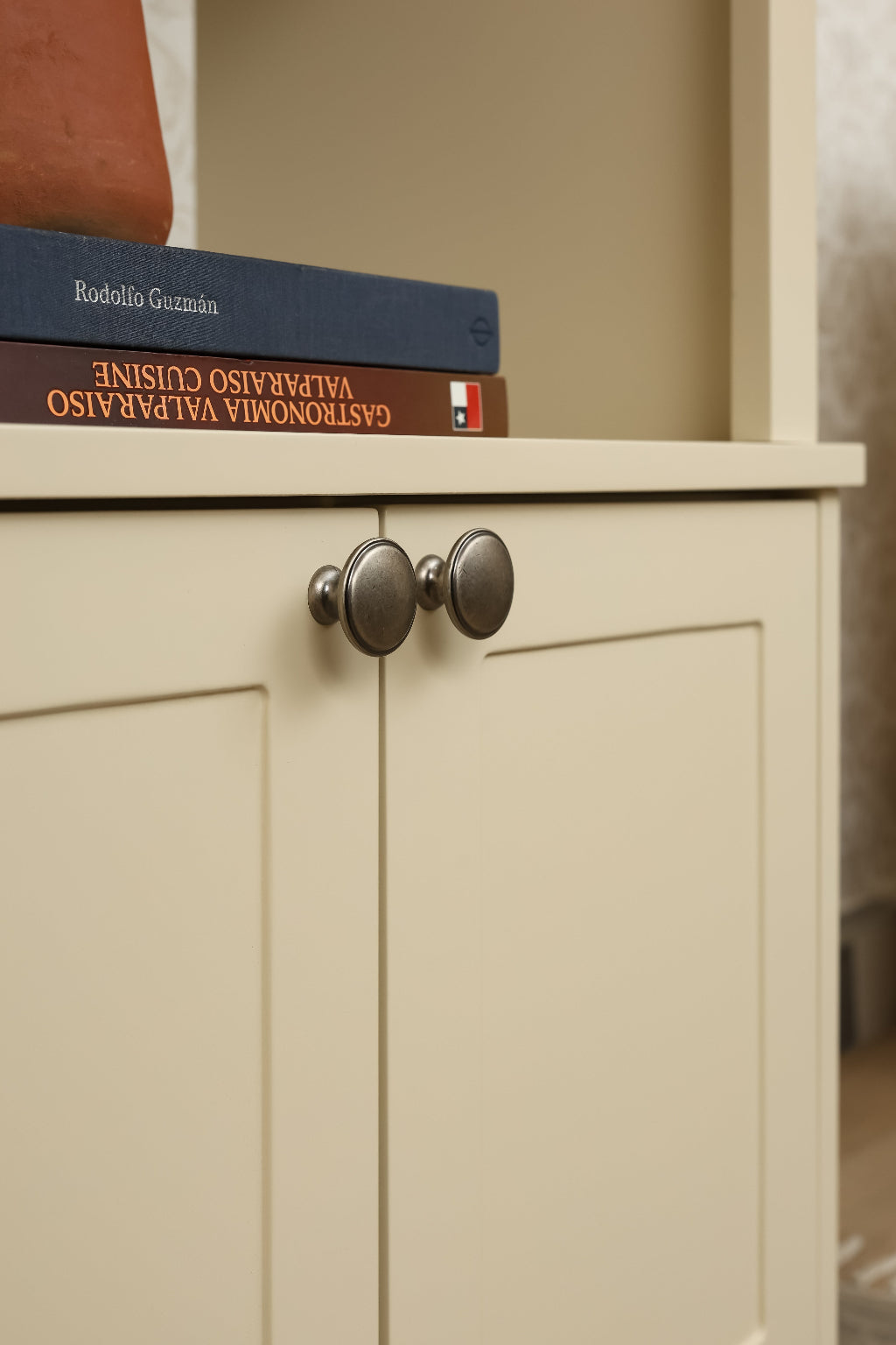 Sus repisas abiertas invitan a crear composiciones personales que cambian con el tiempo. En la parte inferior, sus puertas permiten guardar aquellos objetos que prefieres mantener resguardados, logrando un equilibrio entre exhibición y funcionalidad. Su estética atemporal se integra con naturalidad en living, estudio o dormitorio.